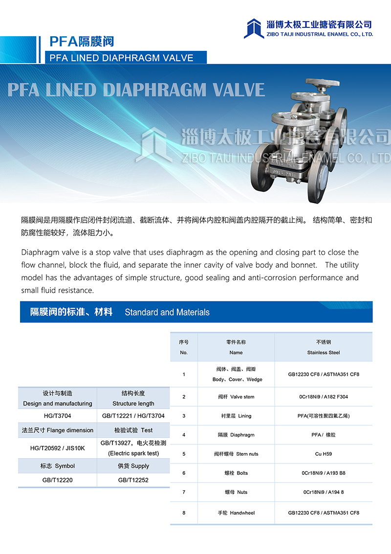 太極氟塑料PFA隔膜閥是用隔膜作起閉件封閉流道、截斷流體、并將閥體內(nèi)腔和閥蓋內(nèi)腔隔開的截止閥。結(jié)構(gòu)簡單、密封和防腐性能較好,流體阻力小。